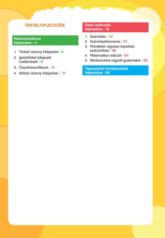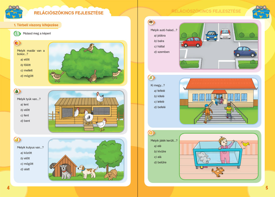 Célzottan, az iskolaérettséghez szükséges alapkészségek tudatos számbavételével, rendszerezésével összeállított feladatok: a térbeli viszonyok kifejtése, az igekötőkkel kifejezett cselekvések, az összehasonlítások, az időbeli viszonyok kifejtése a füzet első részének gyakorló anyaga. Ezek a feladatok a relációszókincs alapkészségek fejlesztését segítik.