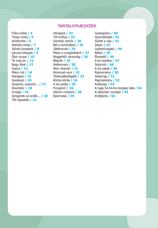 Ebben a kötetben az iskolaérettséghez szükséges alapkészségek tudatos számbavételével, rendszerezésével összeállított feladatok, a gondosan válogatott versek, mondókák, találós kérdések segítségével valósulnak meg. A szerzők nagy figyelmet fordítottak arra, hogy olyan szövegeket válasszanak, melyekben a gyerekek környezetéhez, mindennapi életéhez kapcsolható témák jelenjenek meg, célzottan ehhez a korosztályhoz alkalmazkodva. Így megvalósul a sokoldalú ismeretfejlesztés, a szókincsbővítés, a szövegértés, a fogalompontosítás, valamint a gyermeki fantázia, a képzelőerő további növelése. A feladatok ösztönzik a gyermeket abban, hogy önállóan, egész mondatokban, összefüggően beszéljen a képekről. Megfigyelhetjük a gyermek kreativitását, egyéni szóhasználatát, általános tájékozottságát, valamint a kommunikációs képességéről is képet alkothatunk.
