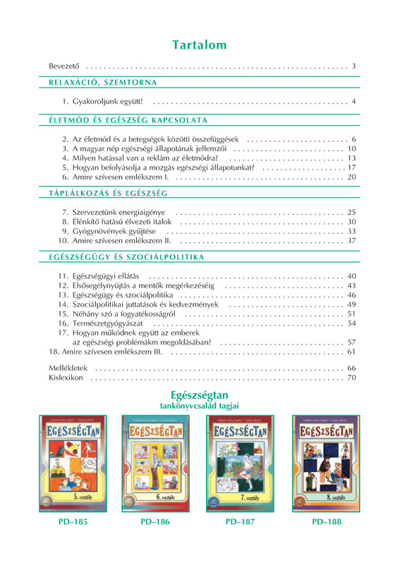 A szerzők célja, hogy a tanulók megismerjék az emberi test csodáit, szervezetük működését és az egészségüket veszélyeztető tényezőket. Számos hasznos tanácsot nyújtanak a balesetek és betegségek megelőzéséhez, illetve a kialakult veszélyhelyzetek megfelelő kezeléséhez. Nyomon követik a kiskamaszok serdülőkori változásait és problémáit, ami szorosan összefügg a helyes táplálkozás, a tisztálkodási szokások, a megfelelő mozgásigény áttekintésével. Segítik a tanulók személyiségének, önismeretének formálódását, s azt is vizsgálják, hogyan és mit befolyásolnak a családi viszonyok és a kortársi kapcsolatok.