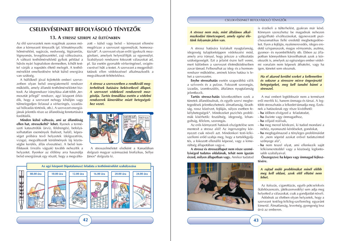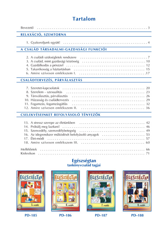 A szerzők célja, hogy a tanulók megismerjék az emberi test csodáit, szervezetük működését és az egészségüket veszélyeztető tényezőket. Számos hasznos tanácsot nyújtanak a balesetek és betegségek megelőzéséhez, illetve a kialakult veszélyhelyzetek megfelelő kezeléséhez. Nyomon követik a kiskamaszok serdülőkori változásait és problémáit, ami szorosan összefügg a helyes táplálkozás, a tisztálkodási szokások, a megfelelő mozgásigény áttekintésével. Segítik a tanulók személyiségének, önismeretének formálódását, s azt is vizsgálják, hogyan és mit befolyásolnak a családi viszonyok és a kortársi kapcsolatok.