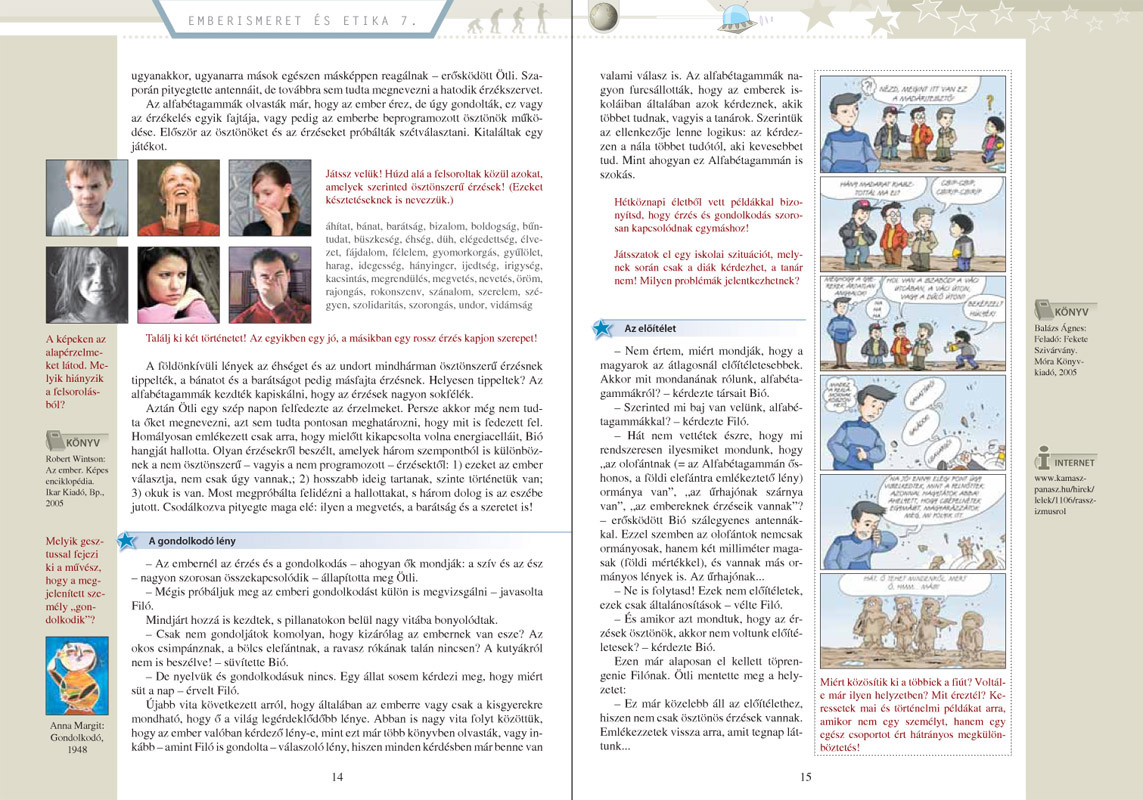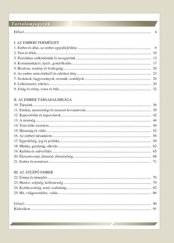 Egy idegen bolygóról három különös lény landol picike űrhajójával a budapesti állatkertben. Azt a feladatot kapták, hogy fedezzék fel és lehetőleg minél színesebben mutassák be a Földön élő legfejlettebb élőlényt, vagyis az embert… Már ez a néhány sor is elárulja, hogy nem hagyományos tankönyvvel fog találkozni az a pedagógus vagy tanuló, aki ezt a kötetet a kezébe veszi. Az egyes erkölcsi problémák feldolgozása ugyanis a három arasznyi lény – Bió, Filó és Ötli – vitatkozó, érvelő, cáfoló párbeszédére épül. A leckékben számos szépirodalmi és szakirodalmi forrás, kérdés és feladat kapott helyet, melyek az egyes témák feldolgozását segítik. A bő kínálat célja, hogy vitára, beszélgetésre, önálló tanulásra, tapasztalatgyűjtésre, információszerzésre és gondolkodásra ösztönözze a tanulókat, valamint segítséget adjon autonóm személyiségük kibontakozásához.
