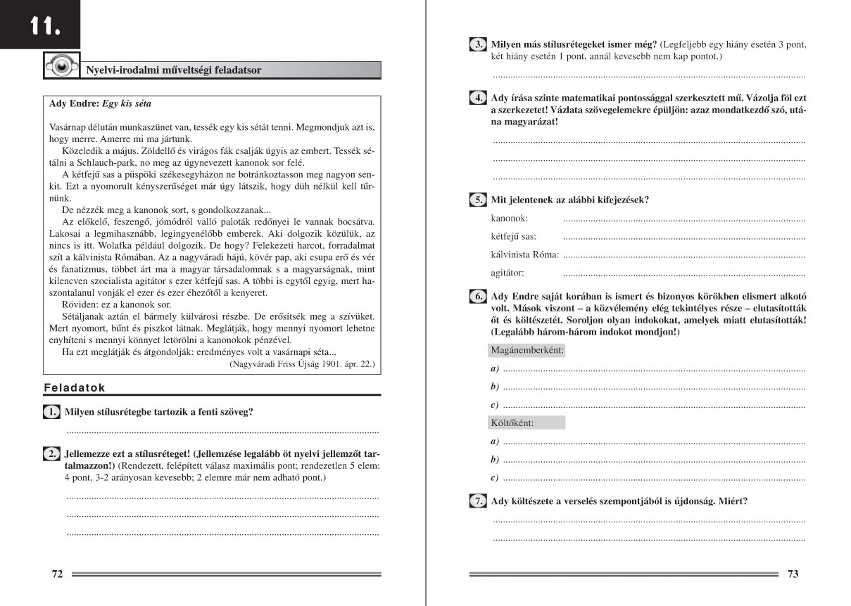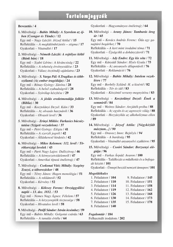 A kötet az emelt szintű magyar érettségi vizsgára való felkészüléshez nyújt segítséget. A szerző 15 teljes feladatsort állított össze a gyakorláshoz. A feladatok elsődlegesen a vizsgára készülők önálló munkájára építenek. A kötet a feladatok megoldását is tartalmazza – pontozással. Ezek alapján mindenki értékelheti, minősítheti önmagát.