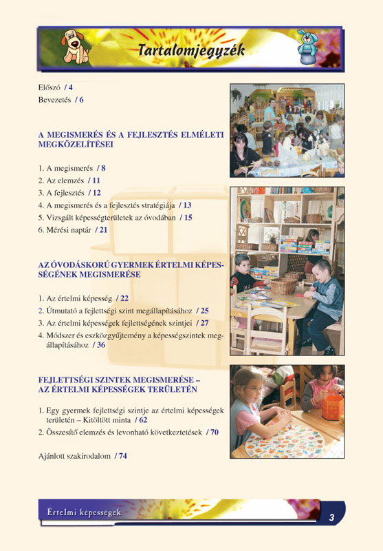 Ez a kötet egy olyan vizsgálati és mérési eljárásba nyújt betekintést, amellyel nyomon követhető gyermeke értelmi fejlődése, megállapítható aktuális fejlettségi szintje. A vizsgálat alapvetően megfigyeléssel és játékos feladatokkal történik, amelyeket Ön is bátran alkalmazhat. A mérés segítségével fényt deríthet azokra a zavarokra, hiányosságokra, amelyek kezelése, pótlása miatt gyermekével szakemberhez kell fordulnia. Ugyanakkor alapja lehet egy beszélgetésnek, amely során kiderülhet, hogyan és mivel támogathatja Ön az óvodapedagógus munkáját, azért, hogy gyermeke minél gyorsabban és látványosabban fejlődjön.
