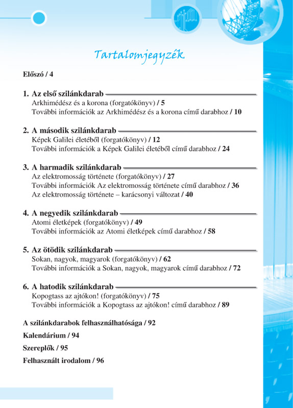 A kötet hat fizikatörténeti forgatókönyvet tartalmaz. Nem színdarabok ezek, inkább narrátor segítségével összefűzött jelenetek, amelyek irodalmi értéke is erősen megkérdőjelezhető. Az előadások valódi lényege – a legendák megjelenítésén túl –, hogy szereplői aktívan kísérleteznek a színpadon. Kik vehetnek részt benne? Bárki, aki fizikát tanul. Természetesen vannak könnyebb és komplexebb témakörök. Arkhimédész történetét a fiatalabbak is értik, a Kopogtass az ajtókon! nagyobb rálátást, érettebb gondolkodást igényel – bár az is mese, mégpedig tanmese. Kiknek ajánljuk a forgatókönyvekkel való „kísérletezést”? Olyan fizikatanároknak, akik szeretnének beépíteni egy-egy jelenetet a tanórába. Olyan drámapedagógusoknak, akik szívesen válnak partnerré a fizika népszerűsítésében. Olyan kollégáknak, akik műsorkészítési feladatot kaptak egy iskolai projekt keretében, vagy csak kihívás elé akarják állítani egy diákcsoportjukat.