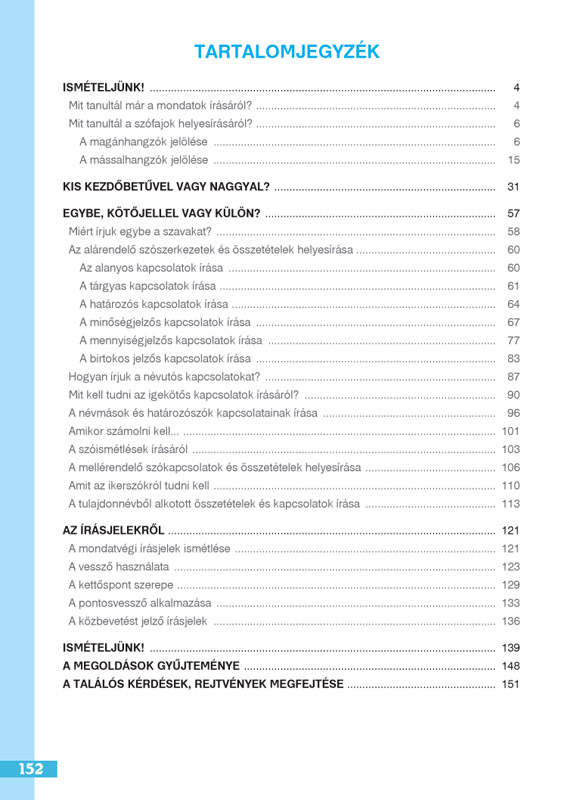 A könyvben lévő feladatok A kisbetűvel, vagy naggyal?, Egybe, kötőjellel, vagy külön? Az írásjelek című témakörök játékos, differenciált elsajátítását, gyakorlását és ismétlését teszik lehetővé. A feladatgyűjtemény bőven kínál lehetőséget ahhoz, hogy minden diák a képességeinek megfelelően válogasson a feladatok közül. A füzetben számos, játékos feladat is helyet kapott, de vannak nehezebb, gondolkodtató feladatok, amelyek próbára teszik a nyelvi leleményességet. A feladatgyűjtemény kiválóan alkalmas a tanulók képességfejlesztésére, egyéni differenciálásra, tehetséggondozásra, felzárkóztatásra, önálló otthoni gyakorlásra.
