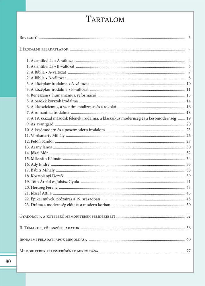 Kötetünk az új feladattípusokból kínál a felkészüléshez feladatokat. A tanulmányok rendjéhez igazodva, stílustörténeti, művelődéstörténeti és műfajelméleti ismeretekhez, valamint jelentős alkotói életművekhez kapcsolódva 23 irodalmi feladatlap és azok önellenőrzésre szolgáló megoldása kínál gyakorlási lehetőséget.