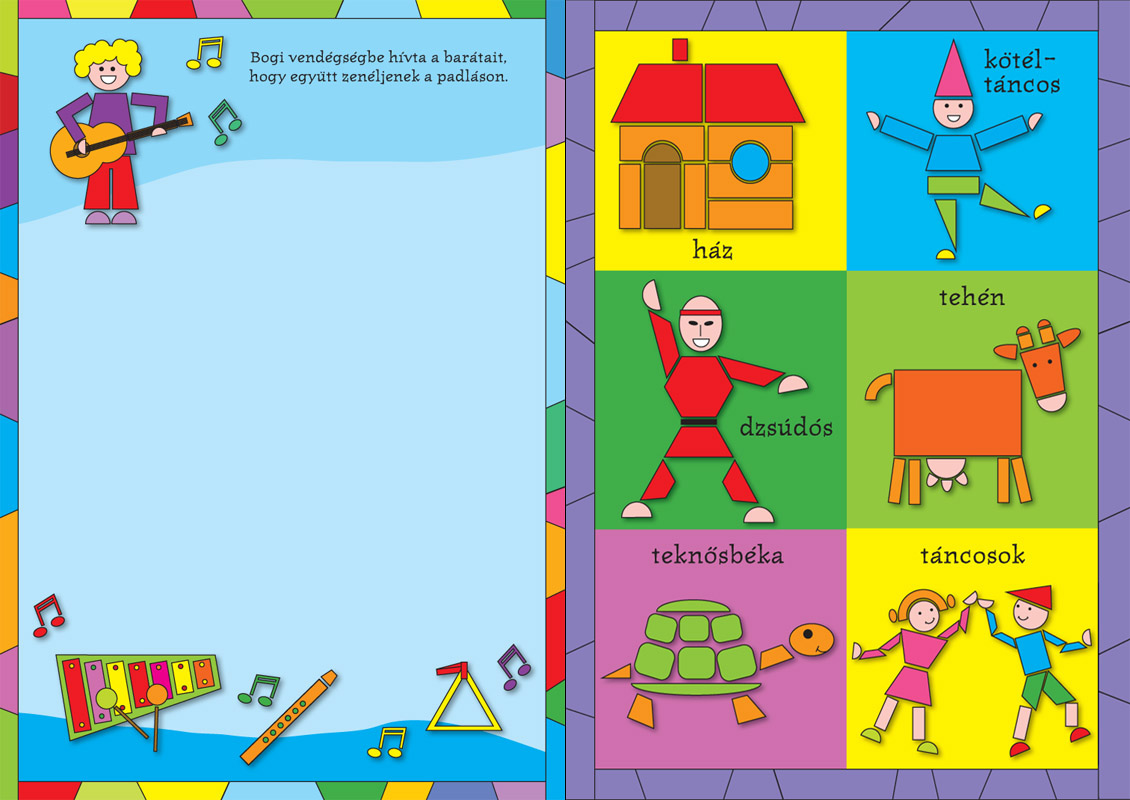 Vidám feladatok, játékos tanulás! A kör, a négyzet, a téglalap, a háromszög és a trapéz egyszerű síkidomok, mégis száz meg százféle személy, állat, tárgy állítható össze belőlük. Csak türelem és némi találékonyság kell hozzá, s máris megtelnek az üres oldalak azokkal az ötletes illusztrációkkal, melyeket a gyermekek – esetleg a család többi tagjával közösen – egy-egy történethez álmodtak meg. A több száz matrica nemcsak a kiadványokban található ötletek megvalósítását teszi lehetővé, szülői vagy testvéri segítséggel a gyermekek maguk is tervezhetnek újabb elemeket.