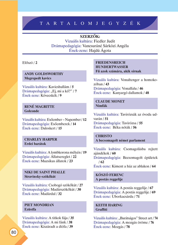 A művészeti nevelést nem lehet elég korán kezdeni. Kiadványunk olyan foglalkozási tervekkel szeretné segíteni az óvodapedagógusok munkáját, amelyek játékos formában fedeztetik fel a legfiatalabb korosztályok tagjaival a képzőművészeteket, pontosabban szólva a kortárs műveket. A szerzők tíz művész egy-egy alkotását dolgozták fel úgy, hogy gazdag válogatást nyújtanak saját szakterületük, a vizuális kultúra, a drámapedagógia és az ének-zene pedagógiai módszereiből és eszköztárából. Az alkotások között festményeket, szobrokat, graffitit egyaránt találunk, de izgalmasnak ígérkezik az akcióművészet egyik terméke, a becsomagolt épület is. Kiadványunk elsősorban az óvodapedagógusok számára jelenthet újdonságot, de számos ötletet adhat az általános iskola alsó tagozatán, illetve a művészeti iskolákban tanító pedagógusok óráinak tervezéséhez, megújításához is.