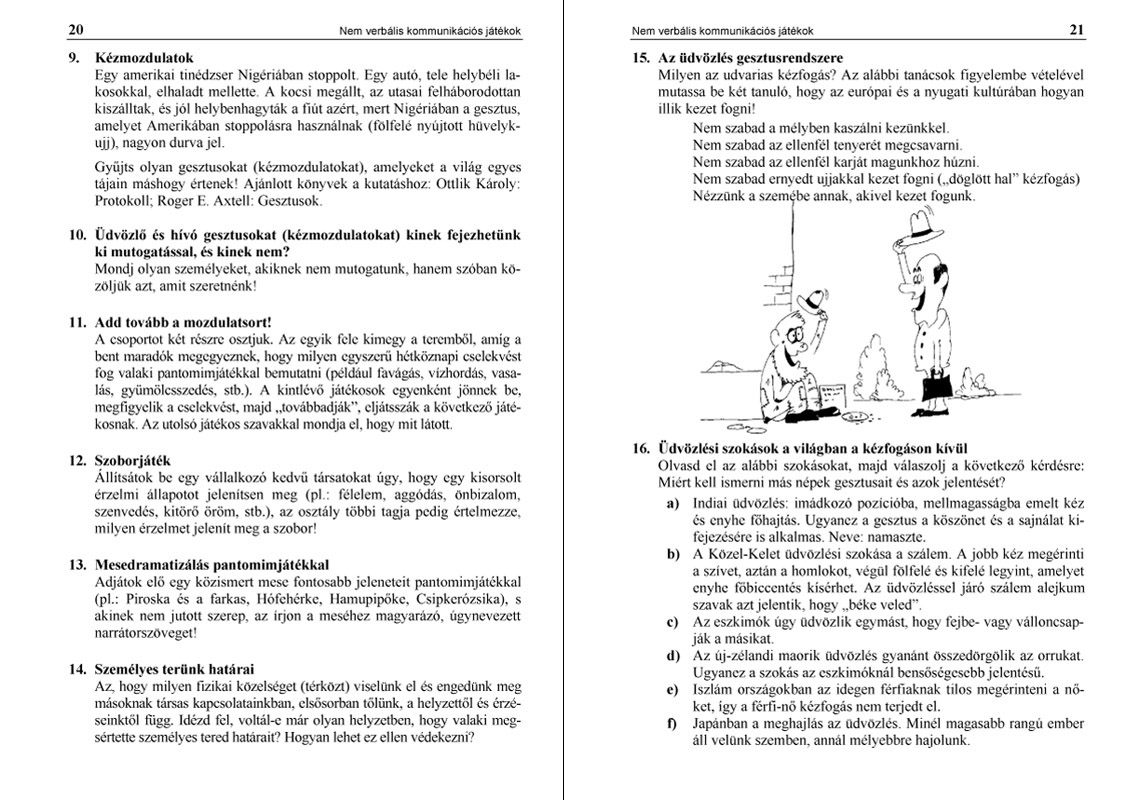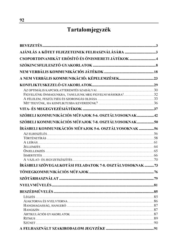 A kötetben lévő feladatok, gyakorlatok számos tanulásszervezési formában elvégezhetők, és a kommunikáció minden ágára kiterjednek. A felhasznált szövegek és a hozzájuk kapcsolódó utasítások igen széles skálán mozognak, az élet szinte minden területét felölelik. Ízelítő a fejezetek címeiből: csoportdinamikát erősítő és önismereti játékok, szókincsfejlesztő gyakorlatok, a nem verbális kommunikáció, konfliktuskezelés, vita- és megegyezésjátékok, szóbeli és írásbeli kommunikációs műfajok, tömegkommunikáció, szótárhasználat, nyelv- és beszédművelés. A feladatok, gyakorlatok magyar- és osztályfőnöki órán egyaránt jól hasznosíthatók, de használhatók tanórán kívüli csoportfoglalkozásokon (napközi, szakkör, osztályrendezvény, ismerkedési est, táborozás stb.) is.