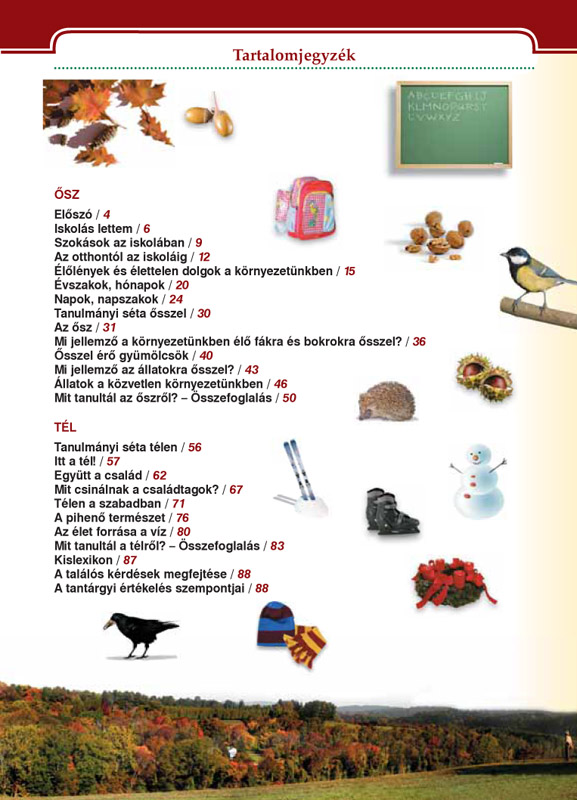 A kétkötetes munkatankönyv elsősorban saját élményekre, tapasztalatokra épít. A szerzők segítik az iskolai beilleszkedést, mivel először új környezetükkel, annak szokásaival ismertetik meg a tanulókat. Ezt követi a természet változásainak, az évszakok emberekre gyakorolt hatásának, az állatok viselkedésének és a növényvilág jellemzőinek megfigyeltetése. A tanulók megismerkedhetnek az emberi test felépítésével, az érzékszervek működésével, a testi higiéniára vonatkozó alapvető illemszabályokkal. Mindeközben egyszerű kísérleteket végeznek, tanulmányi sétákon vesznek részt. Az I. kötet feladatai az őszhöz és a télhez, a II. köteté pedig a tavaszhoz és a nyárhoz kapcsolódnak.