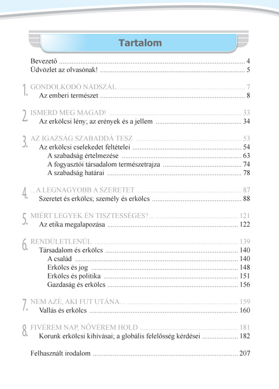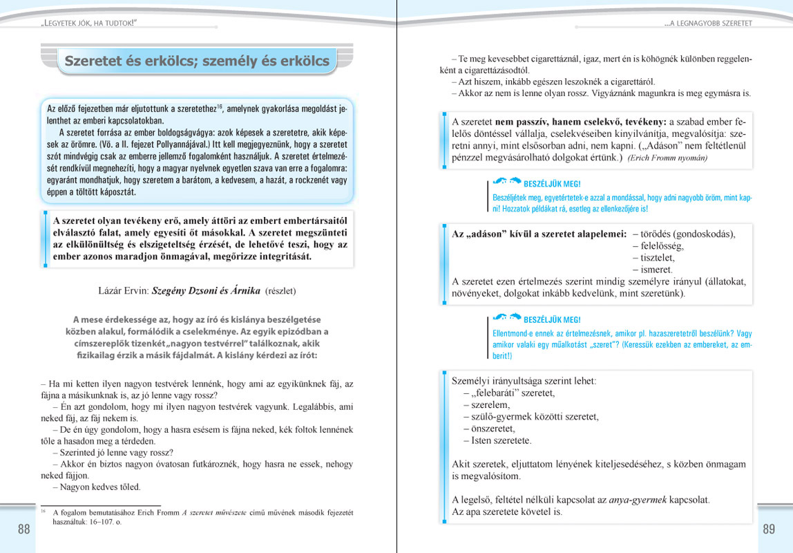 A tankönyv elsősorban szépirodalmi szemelvényeket tartalmaz, ezeket elemzi etikai szempontból. A szövegekhez kérdések, feladatok kapcsolódnak, amelyek segítséget nyújtanak a feldolgozáshoz. A szöveggyűjtemény egyik fő jellemzője a tartalmi-műfaji sokszínűség, amely lehetőséget biztosít a differenciálásra, a téma bemutatására leginkább alkalmas szöveg kiválasztására. Például a szabadság értelmezéséhez a pedagógus segítségül hívhatja Lázár Ervint vagy Dosztojevszkijt is aszerint, hogy milyen korosztályú, értelmi és érzelmi fejlettségű tanulókkal dolgozik éppen.