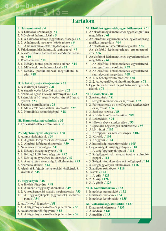 A tizedikes korosztály nyelvi, értelmi fejlettségéhez jól igazodó tankönyv a gyakorlatot állítja a középpontba. Kilenc fejezetben az alábbi témaköröket tárgyalja: halmazelmélet, a hatványozás kiterjesztése, kamatoskamat-számítás, algebrai egész kifejezések, függvények, elsőfokú egyenletek, egyenlőtlenségek; geometria, kombinatorika, valószínűség-számítás és statisztika. A tankönyv végén – hasonlóan a kilencedikes kötethez – egy gyűjtemény található, melynek megoldásához a tanulóknak kell matematikai modellt találni. Ez a rész segít felmérni azt, hogy mennyit fejlődtek az önálló problémamegoldásban.