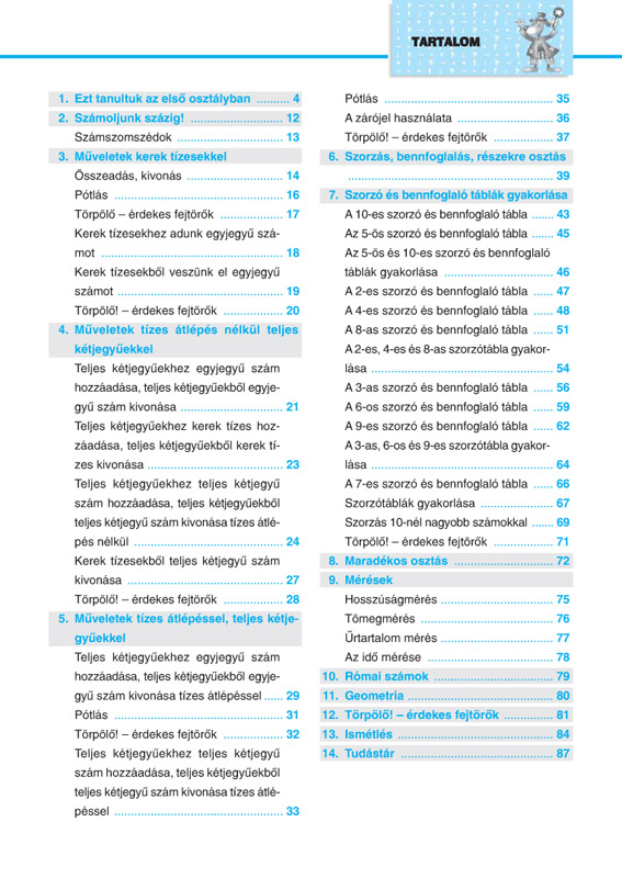 A másodikosok számára készült munkafüzet először az előző évi tananyagot ismétli át. Ezután a tanulók megismerkednek a számokkal 100-ig. Megtanulnak összeadni, kivonni, szorozni, osztani ebben a számkörben, foglalkoznak a zárójel használatával, a maradékos osztással, a római számokkal. Segítséget kapnak ahhoz, hogy a szöveges feladatok értelmezését, matematikai nyelven történő felírását és megoldását lépésről lépésre végre tudják hajtani. A munkafüzet ismétléssel zárul, ami segítheti a gyermekeket tudásuk ellenőrzésében.