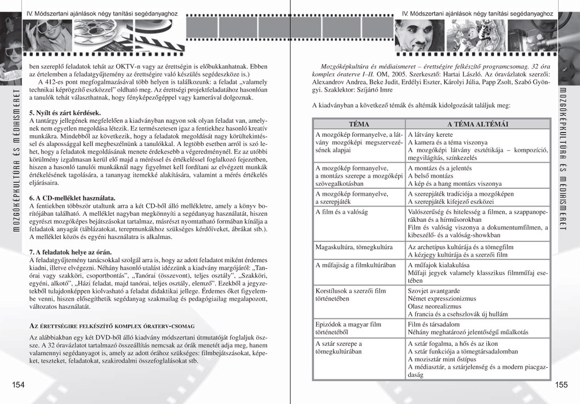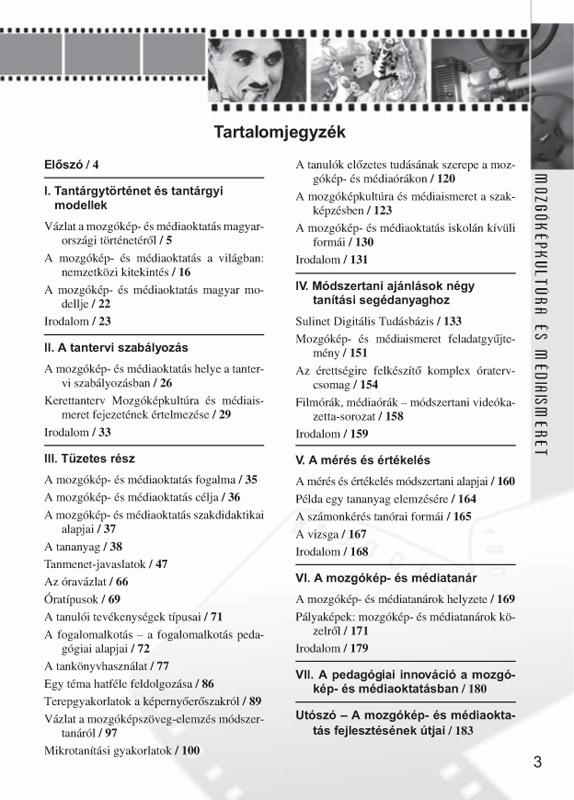 A 2012-es Nemzeti Alaptanterv újraszabályozta a mozgóképkultúra és médiaismeret tanítását. A gimnáziumok 9(–10). évfolyamán kötelezően választható tantárggyá tette, míg 11–12. évfolyamon a művészetek műveltségterület keretében az iskola dönthet arról, hogy fogja-e – és ha igen, akkor milyen arányban – tanítani. A kézikönyv azokat a leendő és gyakorló pedagógusokat segíti, akik fontosnak tartják és vállalják, hogy megtanítják tanítványaiknak a filmes alkotások és médiaszövegek értelmezéséhez szükséges szempontokat. A szerző gondolatmenete jól áttekinthető, legkisebb egységét azok a mikrotanítási gyakorlatok jelentik, amelyek tapasztalati bázisául valós tanórai helyzetek szolgáltak. Foglalkozik tantárgytörténettel, a mozgókép- és médiaoktatás céljával, szakdidaktikai alapjaival, a tanítási óra tervezésével, a tanulói tevékenységek típusaival, a mérés és értékelés kérdéseivel egyaránt. Több tanítási segédanyagot is bemutat, illetve rövid kitekintést ad a fejlesztés lehetséges útjairól.