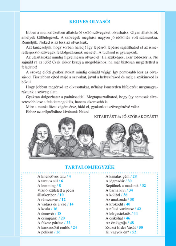 A kiadványban feldolgozásra szánt 25 szöveg többsége különleges állatokról szóló információk. Műfajukat tekintve elsősorban leíró jellegű szövegek. Minden szöveg előtt olyan olvasástechnikai, mondatértelmezési bevezető gyakorlatok vannak, melyek a pontosabb olvasáshoz, a szavak tisztább kiejtéséhez, a kialakuló helyesíráshoz, a szókincs bővítéséhez segítik a gyermeket. A különböző ejtési gyakorlatok javítják a tanulók beszédkészségét, lehetőséget adnak az olvasási technika elmélyítésére és az olvasási tempó javítására. A feladatok segítségével mechanizálja a szövegértés lépéseit, és gyakorolja a néma olvasást, mely a szövegfeltátás alapja. A szövegben lévő ismeretlen kifejezések magyarázata a szöveg alatt, lábjegyzetben megtalálhatók.
