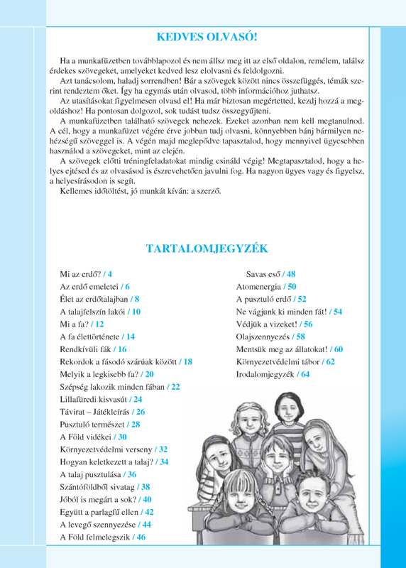 A feldolgozásra szánt 30 szöveg többsége környezetünk és veszélyeztetettsége témához kapcsolódik. Ezen kívül játékleírás, tájékoztató, versenyfelhívás, és hír is helyet kapott a kiadványban. Minden szöveg előtt olyan olvasástechnikai, mondatértelmezési bevezető gyakorlatok vannak, melyek a pontosabb olvasáshoz, a szavak tisztább kiejtéséhez, a kialakuló helyesíráshoz, a szókincs bővítéséhez segítik a gyermeket. A különböző ejtési gyakorlatok javítják a tanulók beszédkészségét, lehetőséget adnak az olvasási technika elmélyítésére és az olvasási tempó javítására.