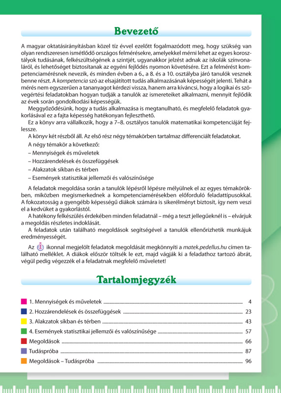 A feladatgyűjtemény első része négy témakörben: mennyiségek és műveletek; hozzárendelések és összefüggések; alakzatok síkban és térben; események statisztikai jellemzői és valószínűsége - tartalmaznak differenciált feladatokat. A feladatok megoldása során a tanulók lépésről-lépésre mélyülnek el az egyes témakörökben, miközben megismerkednek a kompetenciamérésben előforduló feladattípusokkal. A fokozatosság a gyengébb képességű diákok számára is sikerélményt biztosít, így nem veszi el a kedvüket a gyakorlástól.