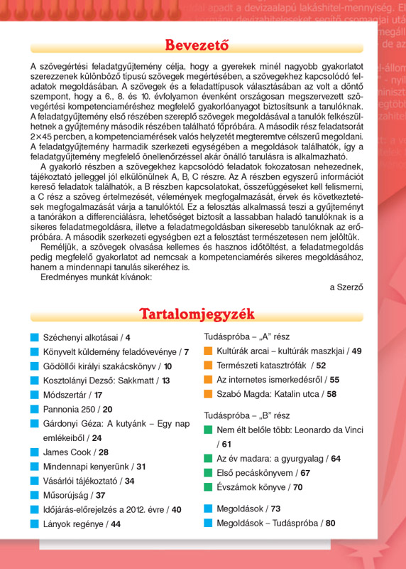 A szövegértési feladatgyűjtemény célja, hogy a diákok minél nagyobb gyakorlatot szerezzenek a különböző típusú szövegek megértésében, a szövegekhez kapcsolódó feladatok feldolgozásában. A szövegek és a feladattípusok választásában az volt a döntő szempont, hogy a 8. évfolyamon évenként országosan megszervezett szövegértési kompetenciaméréshez megfelelő gyakorlóanyagot biztosítsunk a diákoknak. A feladatgyűjtemény első részében található szövegek megoldásával a tanulók felkészülhetnek a gyűjtemény második részében található főpróbára. A második rész feladatsorát 2x45 percben, a kompetenciamérések valós helyzetét megteremtve célszerű megoldani. A feladatgyűjtemény harmadik szerkezeti egységében a megoldások találhatók, így a feladatgyűjtemény megfelelő önellenőrzésre, akár önálló munkára is alkalmazható.