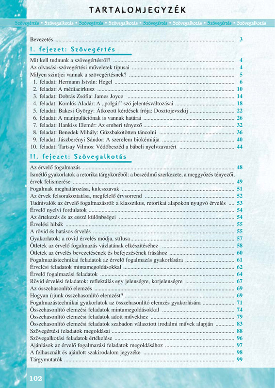 A tankönyv két fő részből áll. Az első részben a magyar érettségivel kapcsolatos hasznos tudnivalók és szövegértési feladatsorok találhatók. A szerző egy-egy feladattípus első előfordulásakor olyan elméleti ismereteket is közöl, amelyek segítik ezek megoldását. A kötet második részében szövegalkotási feladatok kaptak helyet. A tanulók hatékony módszerekkel ismerkedhetnek meg az összehasonlító elemzések, érvelő fogalmazások, reflexiók eredményes megfogalmazásához, illetve gyakorlásra szolgáló vagy ellenőrzésre alkalmas feladatokat oldhatnak meg.