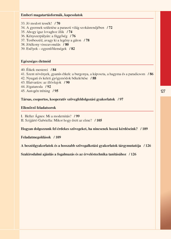A képességfejlesztő kiadvány használói elsajátíthatják, hogyan kell fogalmakat definiálni, összefüggéseket keresni, álláspontot kifejteni; ismertetést, leírást készíteni, hosszabb szöveget tömöríteni, összefoglalni; egy adott témához kulturáltan hozzászólni, szöveget logikusan megszerkeszteni, egynyelvű szótárakat használni, beszámolót készíteni és érveket gyűjteni, csoportosítani; érvelő fogalmazást készíteni. A feladatok megegyeznek a magyar nyelv és irodalom érettségi vizsga írásbeli típusfeladataival. Mivel a tanítási órák csak 45 percesek, a szerző rövidebb szövegekkel és kevesebb feladattal munkáltat. A kiadvány végén viszont két olyan ellenőrző feladatsor található, amely terjedelemben és feladatszámban is igazodik az érettségi követelményeihez.
