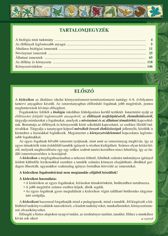 A kislexikon célja, hogy elősegítse az általános iskolában tanított biológiai ismeretek jobb megértését, pontosabb meghatározását. 4-6. osztályban tanulók és tanítók részére. Követi a NAT-ban előírt követelményeket.