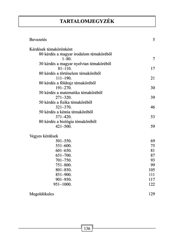 A kötet az általános iskola felső tagozatosainak a tanulását, ismereteik elmélyítését, illetve tudásszintjük felmérését segíti. A szerzők a kérdéseket és a feladatokat a tananyag alapján állították össze. Az első ötszáz kérdés a legfontosabb tantárgyak témaköreit tematikus bontásban kéri számon, míg a második ötszáz kérdés vegyes, az általános műveltségre vonatkozó ismereteket ellenőriz. A kötetet megoldókulcs zárja. A szerzők a kérdések, feladatok és a válaszok megfogalmazásánál is arra törekedtek, hogy a tudásszint felmérése mellett a tanulók asszociációs készsége is fejlődjön. A tesztkérdések önellenőrzésre és gyakorlásra egyaránt alkalmasak, de vetélkedők kérdéseinek összeállításához is hasznosíthatók.